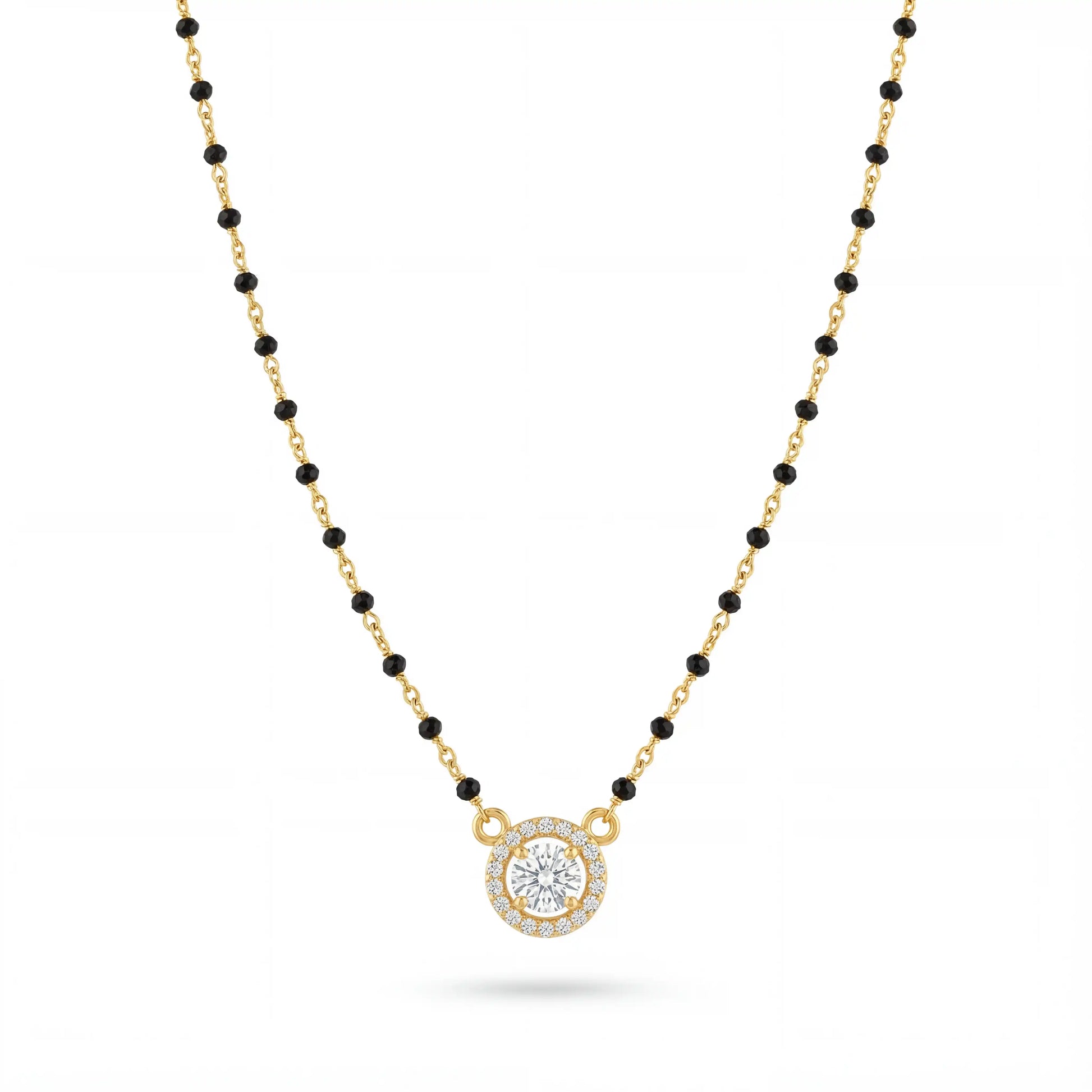 Intricate golden lattices meet black beads — classic symbolism, renewed in elegance.
